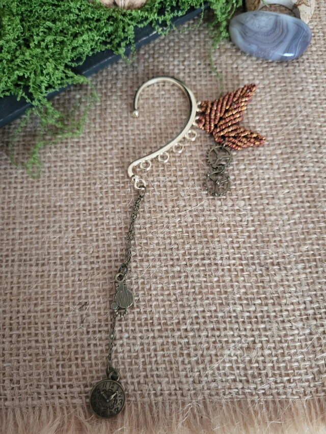 Ailes tissées à la main, associées à des chaînes, rouages, cadrans et breloques mécaniques évoquant le temps, les machines et les mondes oubliés.
