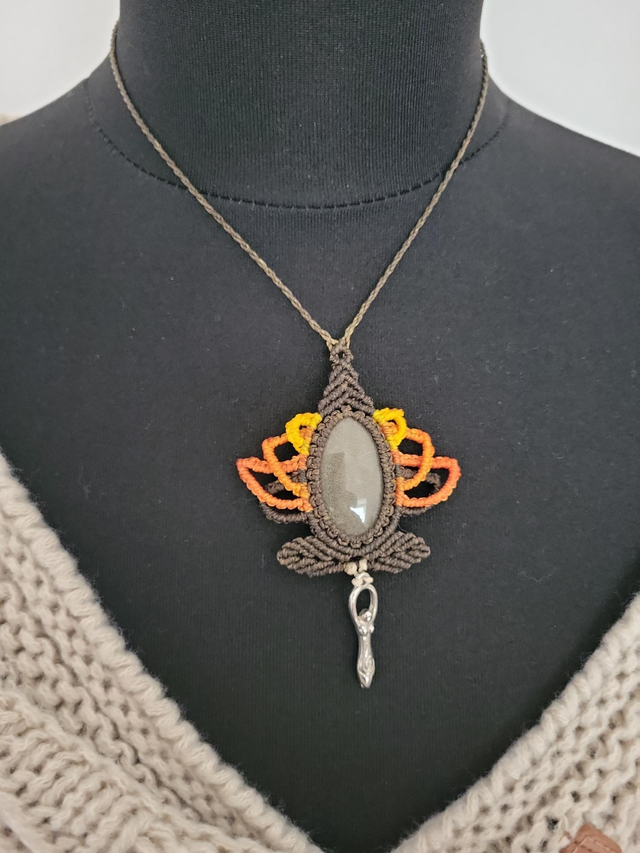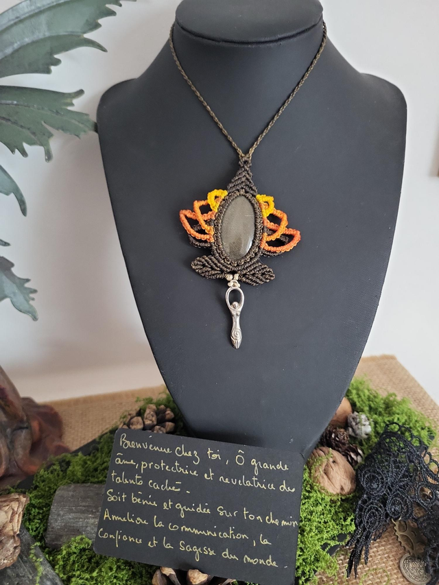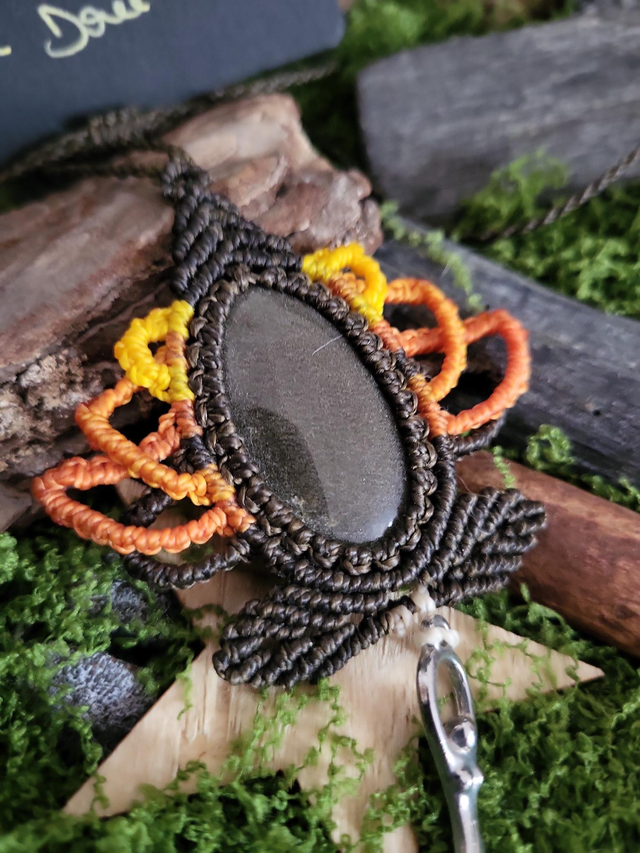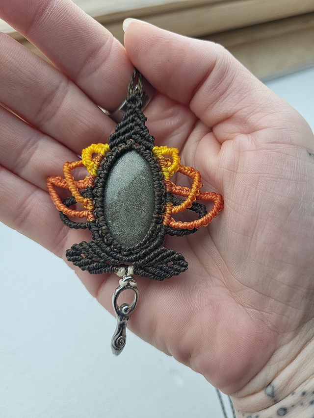Pierre d’ancrage et de lucidité, l’obsidienne dorée éclaire les zones d’ombre, favorise la connaissance de soi et renforce la protection énergétique. Les entrelacs solaires rappellent le lotus enraciné dans la matière, symbole d’élévation, de renaissance et d’équilibre entre l’ombre et la lumière.