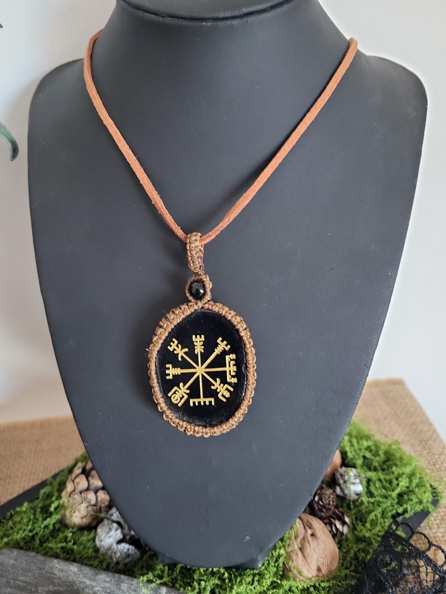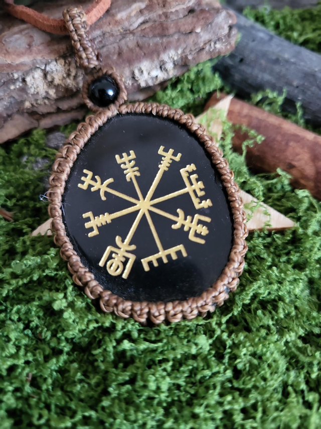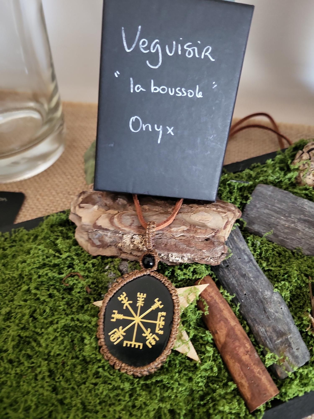 Pendentif orné du Vegvísir, ancien symbole nordique de guidance, gravé sur onyx, pierre d’ancrage et de protection.